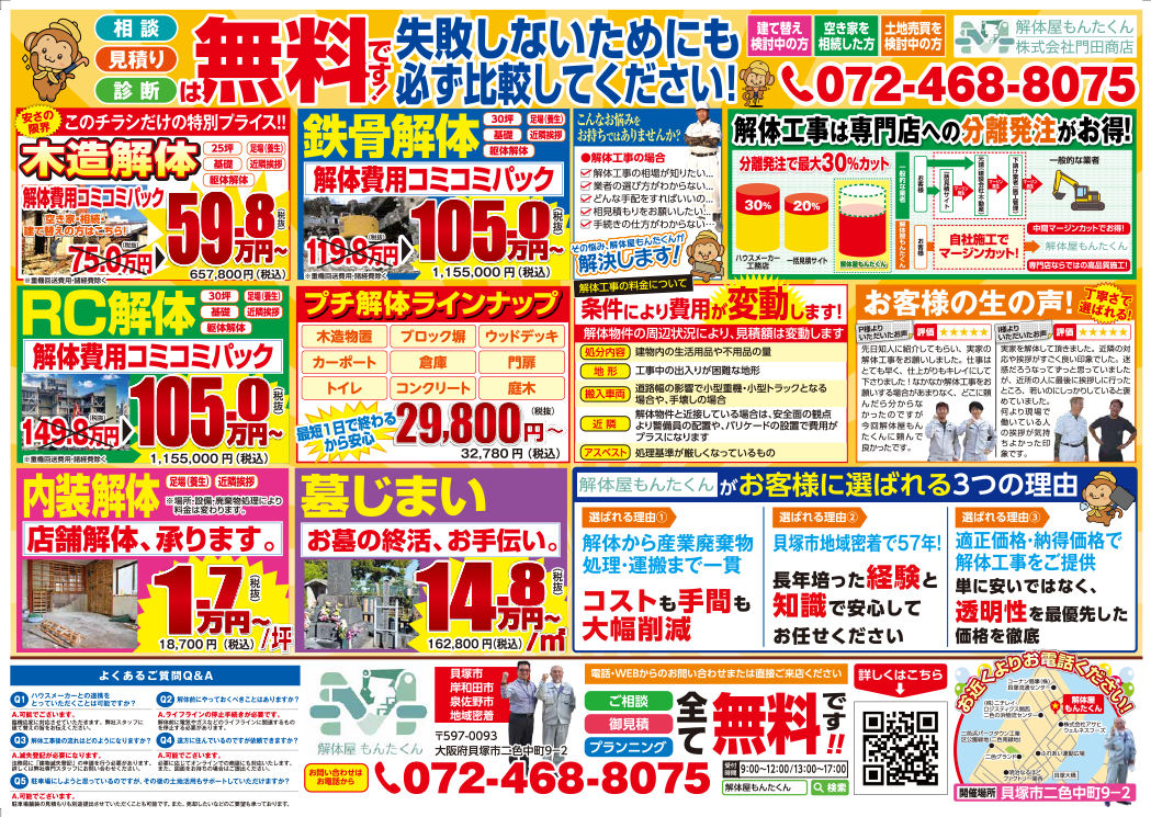 など、どんな些細なご相談でも大歓迎です。 お見積もり・ご相談は無料です。貝塚市の解体工事に関するお悩みは、まず「解体屋 もんたくん」までお気軽にお問い合わせください。