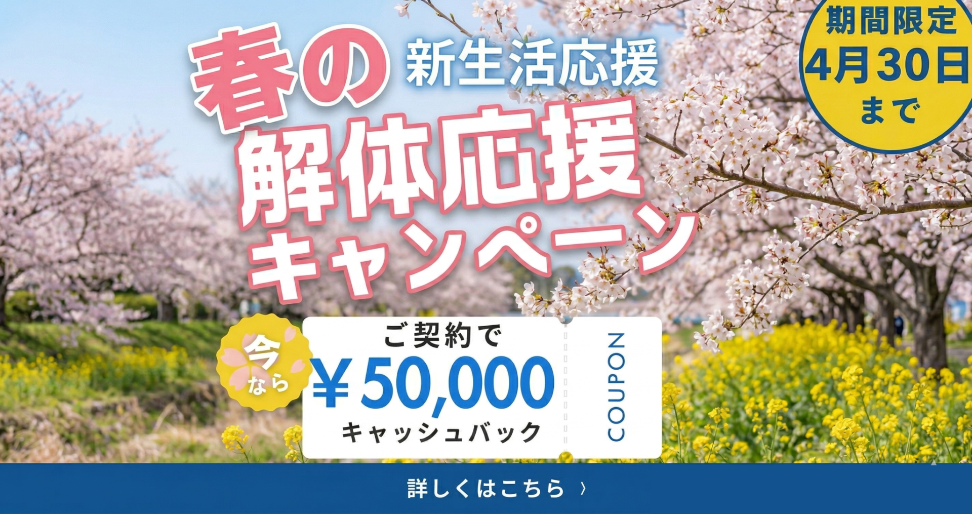 【期間限定】春の解体応援キャンペーン!50,000円キャッシュバック
